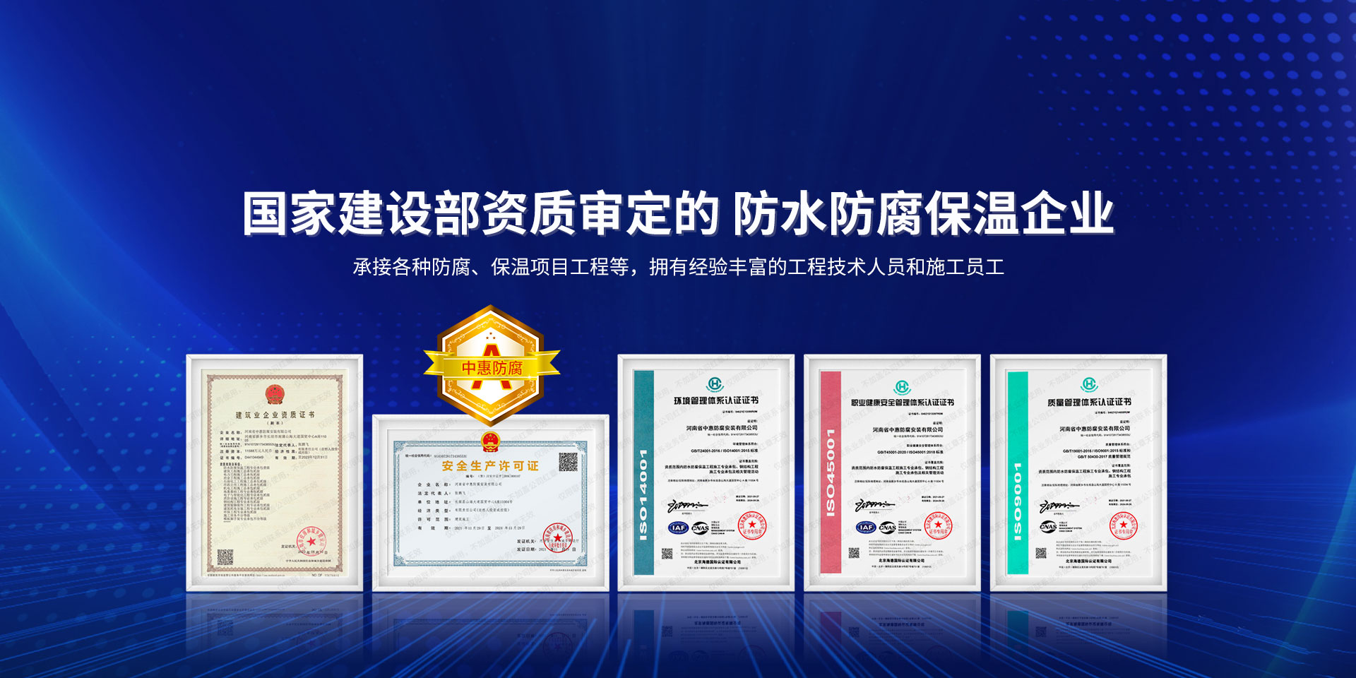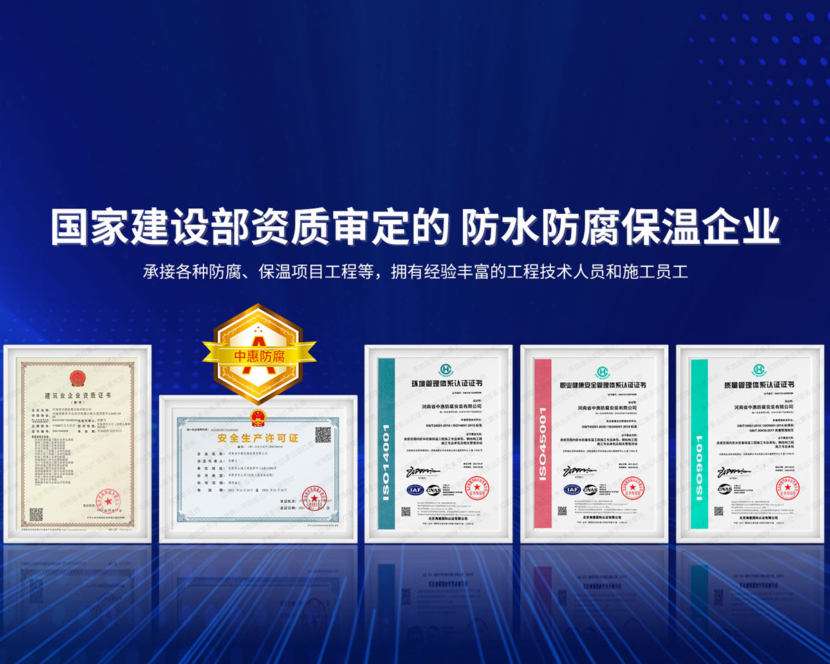 公司經營范圍:防水防腐保溫工程;消防設施工程;建筑裝修裝飾工程;建筑機電安裝工程;電力工程;建筑工程;石油化工工程;工業清洗工程;油罐清洗工程;鋼結構工程;環保工程;模板腳手架工程;電纜防火封堵、防污閃噴涂、外墻外保溫工程;各類施工勞務作業;設備維修、船舶鉚焊、涂裝;電力工程材料、建材、防水材料、防火材料、防腐保溫材料銷售,并相繼通過了GB/T19001-2008idtISO9001:2008GB/T50430-2007質量管理體系認證證書。GB/T24001-2004idtISO14001:2004環境管理體系認證證書。GB/T28001-2011idtOHSAS18001:2007職業健康安全管理體系認證證書。公司是中國防腐蝕于防護協會、中國施工企業管理協會、電力協會和中國鋼結構防水協會會員單位。 公司的經營業務涵蓋了石油、化工、電力、冶金、煤炭、船舶、國防、燃氣、水利、環保、交通運輸、航空及國防軍工和輕紡市政等行業的防腐保溫絕熱設備。鋼結構安裝、防火、防水、金屬噴鍍、聚脲噴繪、陰極保護、防滲透堵漏、玻璃鋼及各種磚版材料襯里、橡膠襯里、煙氣硫和耐酸溶劑腐蝕等工程施工。公司連續十年榮獲“省市先進施工企業”“安全生產先進單位”“重合同,守信用企業”和“AA***資質企業”的稱號。2000年被命名為市級文明單位,2002年被國家工商行政管理局命名為“重合同,守信用的企業”、被中國工業防腐蝕技術協會命名為“防腐蝕企業,能源節約及環境保護領域有豐富的經驗和***的業績。工程一次交驗合格率100%。其中攀枝花鋼鐵公司煉鐵廠四號高爐及熱風爐防腐工程、上海寶鋼公司煤氣柜防腐工程、撫順石油一廠裝置防腐項目、齊魯石化公司稀烴廠高塔防腐工程、吉林化學工業公司煉油廠油罐防腐工程、天津石化熱電廠六號爐頂棚聯絡管保溫工程、大慶油田(太倉)力神泵業工程、中國化學工程第十一建設工程、中原油田勘探局工程、中國石化銷售有限公司華北分部、魯皖輸油管道工程、貴州開磷息烽合成氨工程、陜西黃陵煤化工程、中國石油天然氣西部管道塔里木輸油工程、邯鋼集團邯寶鋼鐵公司煉鐵工程、德州供電工程、吉寶(南通)船廠工程,偃師華潤熱力工程、鄭州熱力總公司。 河南省中惠防腐安裝有限公司愿以豐富的施工經驗,***的技術,***的設備,***的管理,***的服務,竭誠為國內外廣大的用戶提供***滿意、******的工程作品。 我公司愿與國內外同仁一道,團結協作,共同推進防腐蝕行業發展! 公司地址:河南省長垣縣建設路北段360號 固定電話:0373-8866488 郵編:453400 網址:http://www_zhff_com_cn.shrqltd.com
